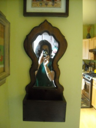 - The shapely wooden one in which I appear holding my camera is more than a mirror; it is a holder of all the keys that come in and out of the house; a $5 treasure from Treasure Mart– it certainly owns the piece of wall that it hangs on right inside the front doorway.